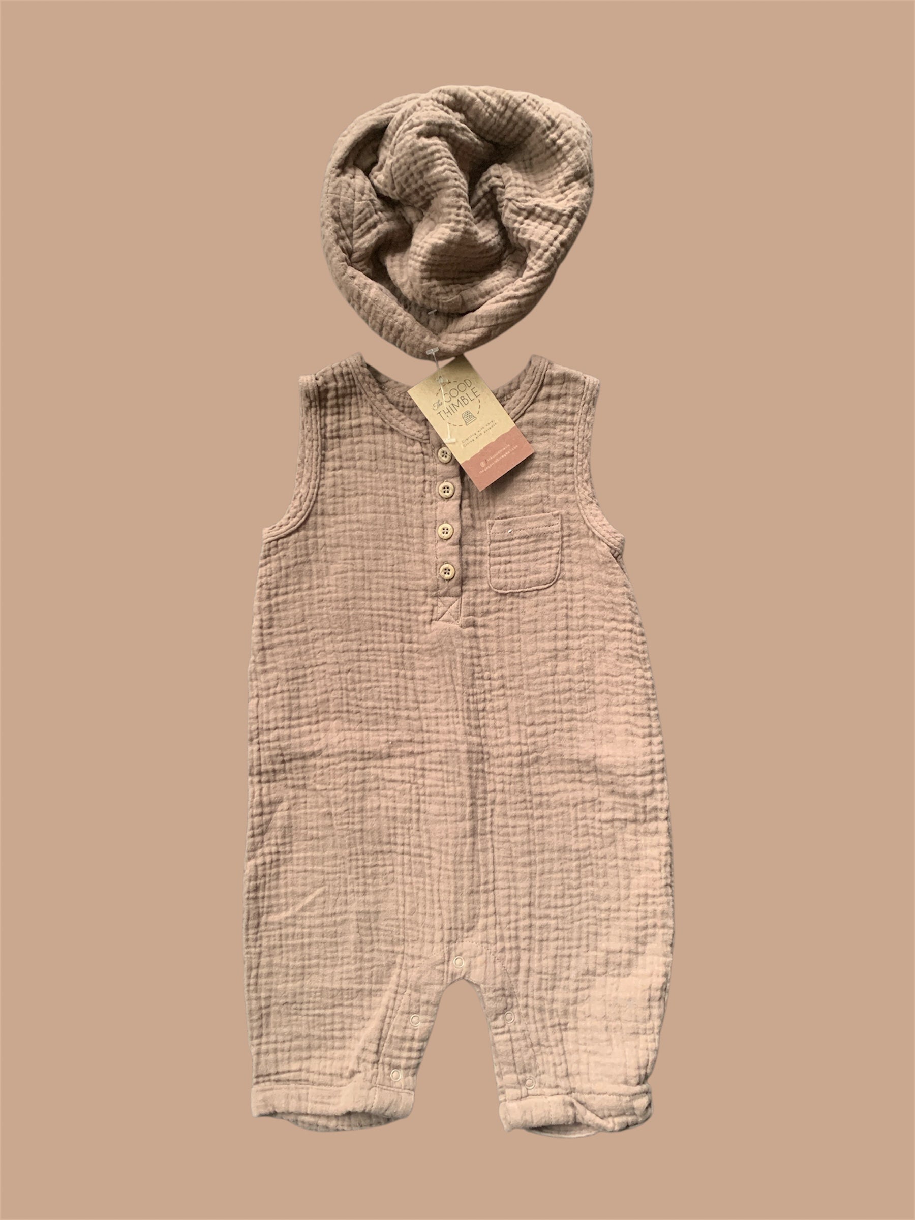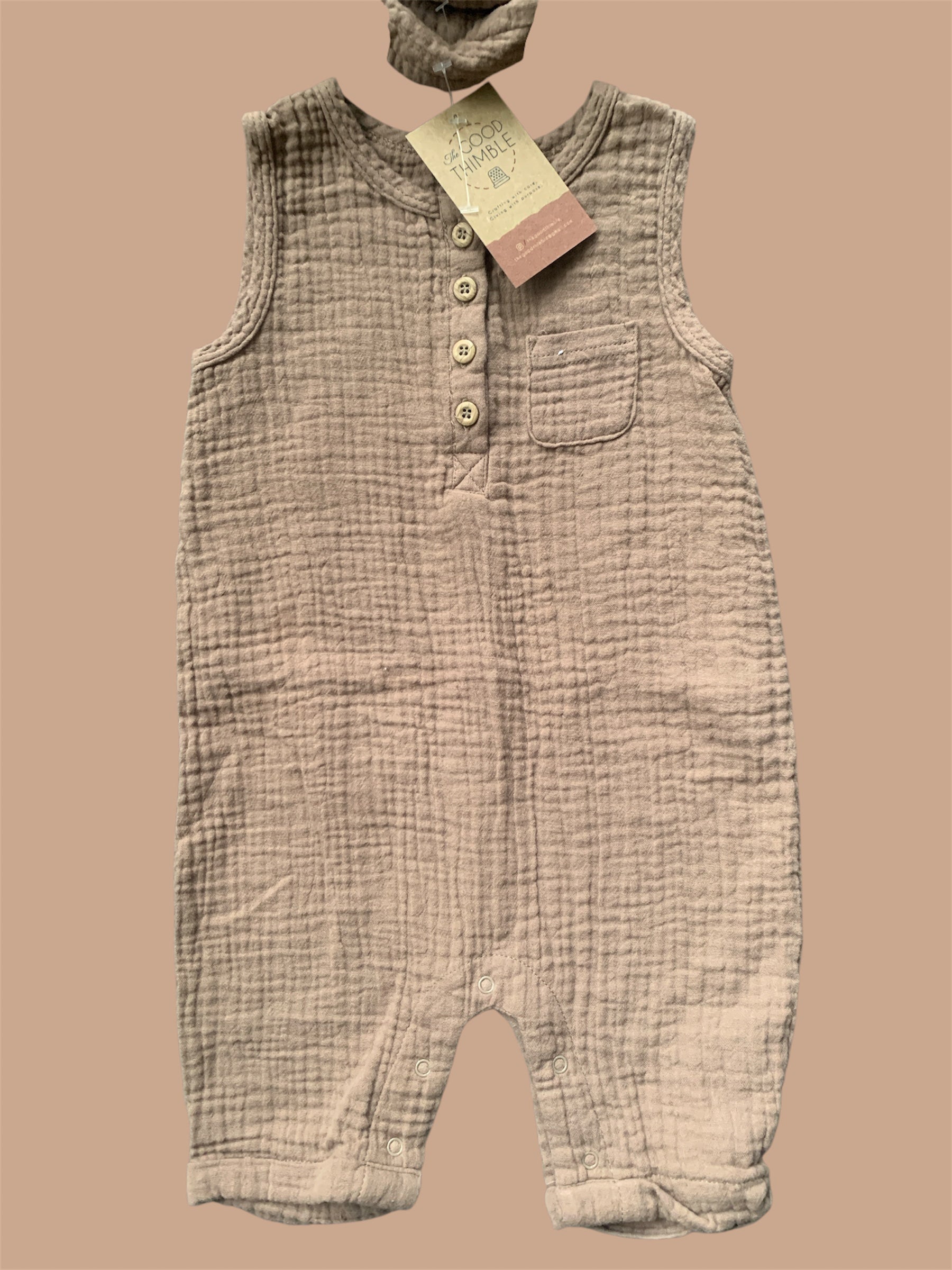 Brown George Gauze Romper/Jumpsuit w/Matching Hat (12-18m)