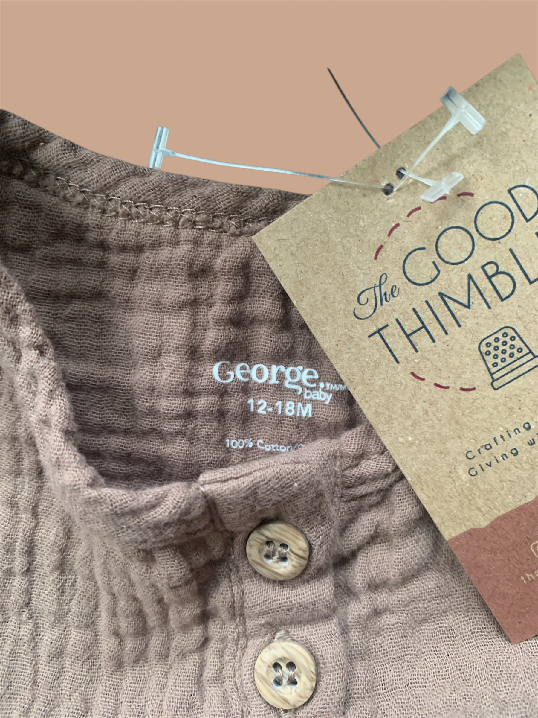 Earthy, soft, and effortlessly stylish. This light brown gauze romper from George is a breathable go-to for warm days, complete with a matching hat to keep little ones shaded and comfy. Sized for 12 to 18 months, it’s perfect on its own or layered for year-round wear. Add custom embroidery for a personal touch that makes it truly one of a kind.
